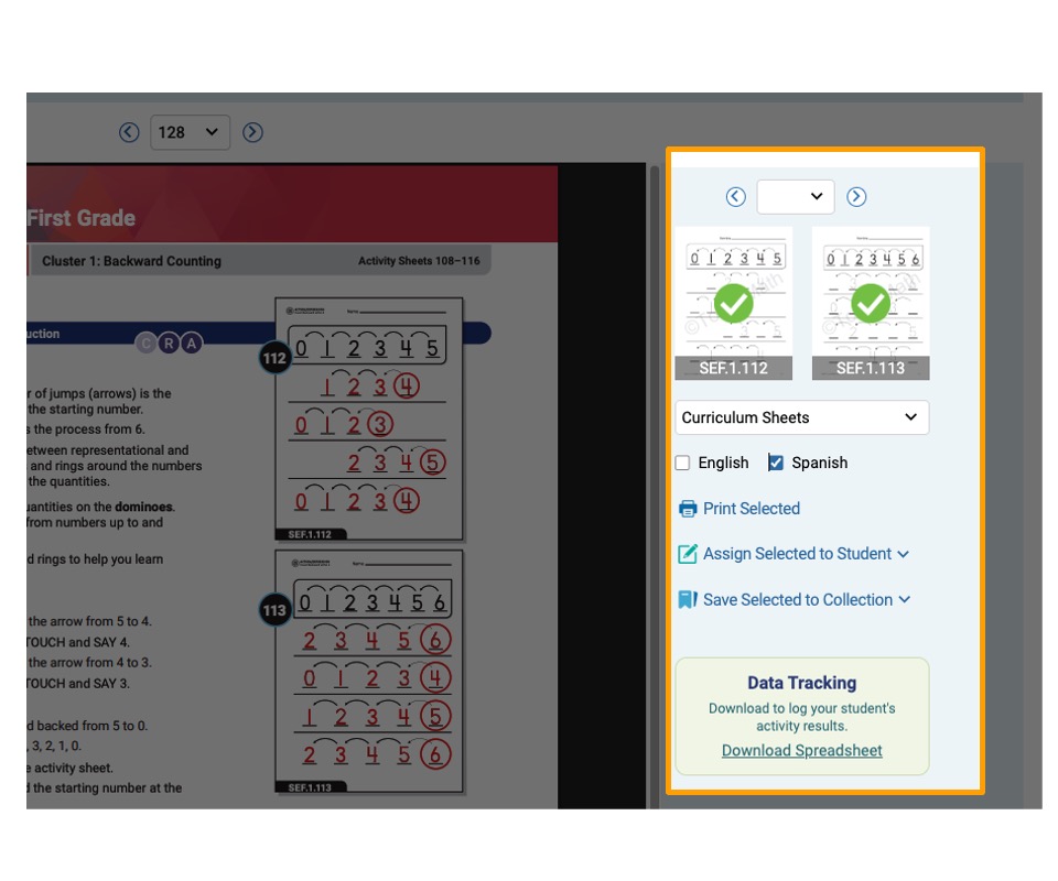 - Use the dial buttons to select English or Spanish for the printed Activity Sheets