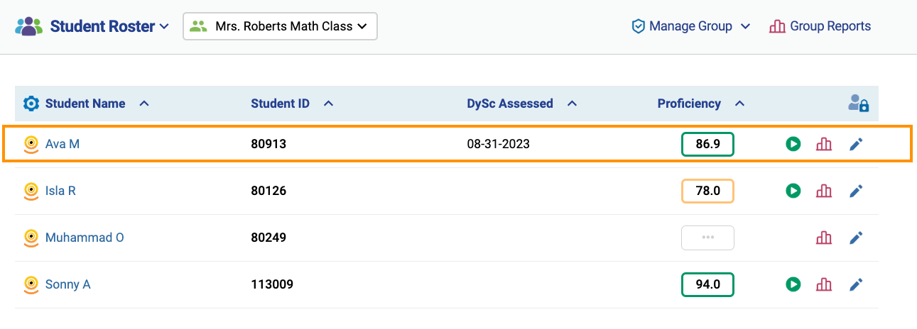 - The roster will display and show each student's overall average. Choose a student to review performance by clicking on the student's name.