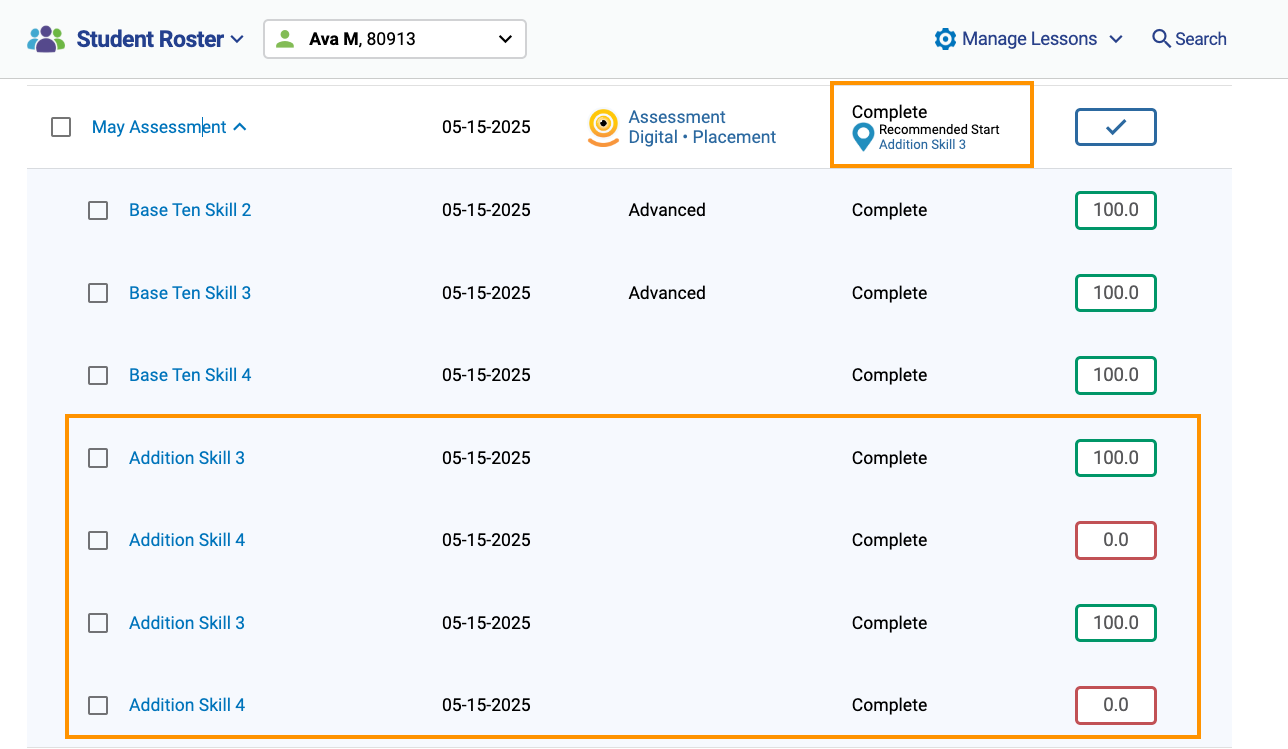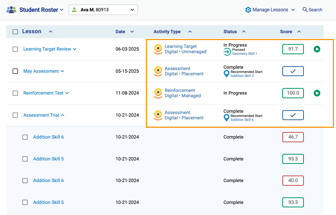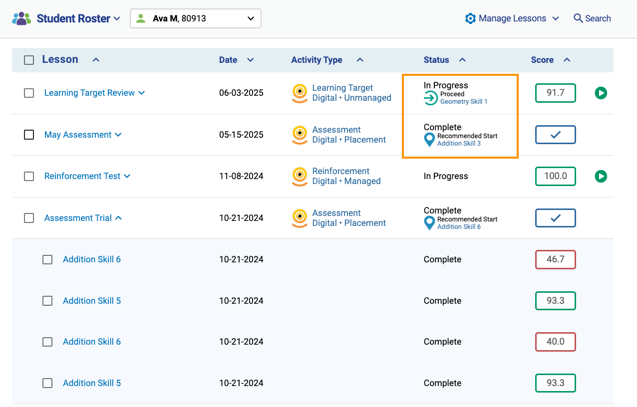 - The Status column also indicates the Targeted Lesson that is most appropriate for the student to complete next. In Ava's record below, her next steps include Geometry Skill 1 and Addition Skill 3.