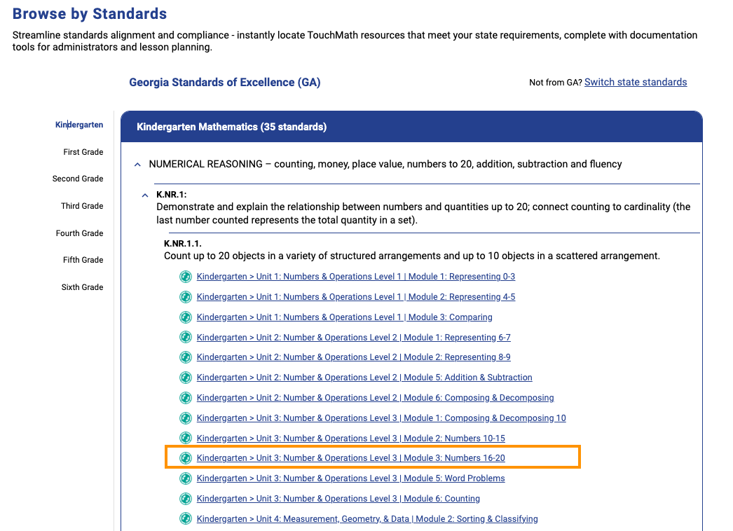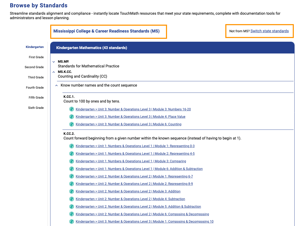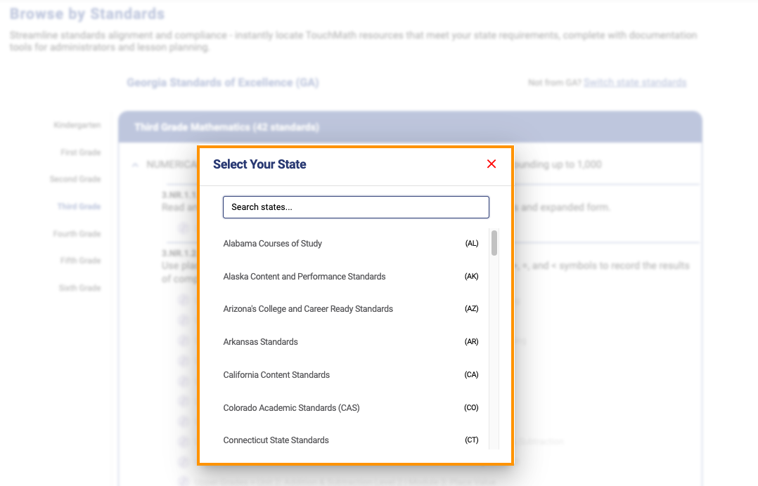 MyTouchMath makes it easy to browse each Teacher's Guide by specific mathematical standards, helping educators quickly identify targeted instruction and resources for their students. TouchMath partners with EdGate, a nationally recognized educational services company that specializes in aligning educational content to academic standards. This partnership ensures reliable, standards-based navigation to support effective lesson planning and student instruction.